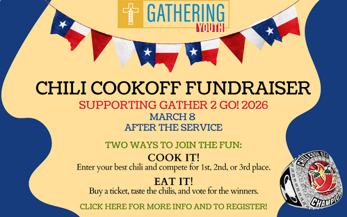 Got a chili that people request by name? This is your moment. Click on the graphic to enter your favorite chili—and compete for 1st, 2nd, or 3rd place honors and help support the Gathering Youth’s summer mission trip while showing off your skills.