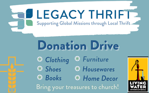 Got a closet full of forgotten treasures? ✨ Bring them to church this week! Your gently used clothing, books, furniture, and home goods can find new life at Legacy Thrift, where every donation helps fund Living Water International and brings safe water to communities around the world. 💧 Give generously—your unwanted items can make an eternal impact!